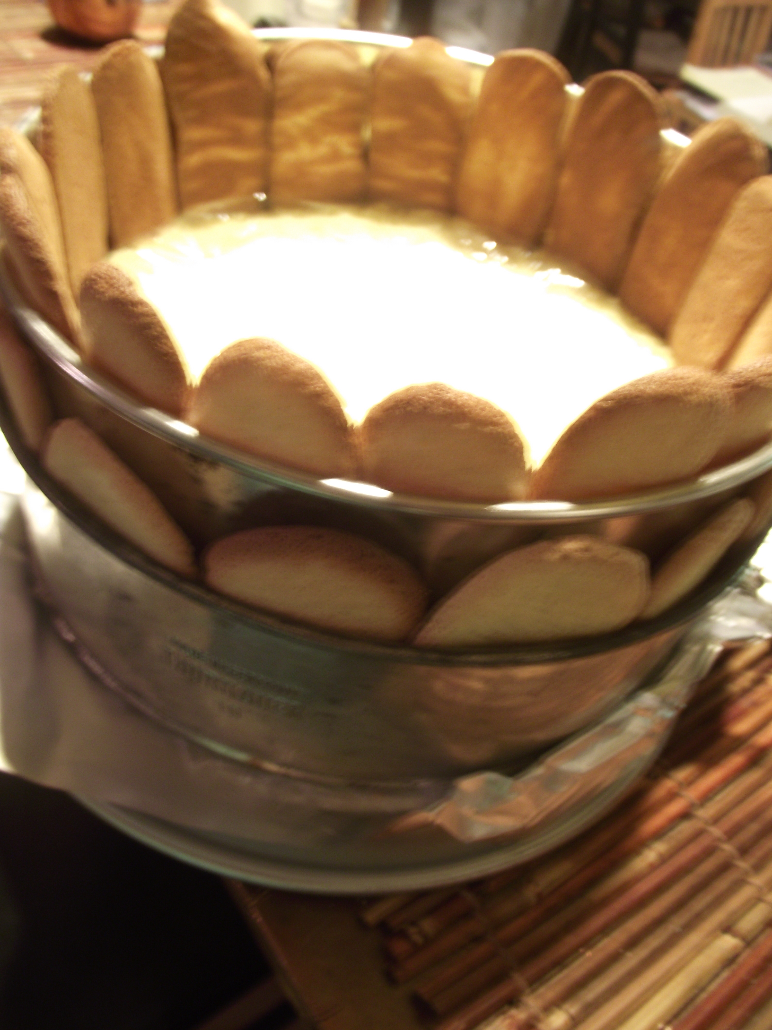 Ladyfingers wrapped around cake and awaiting Charlotte mousse