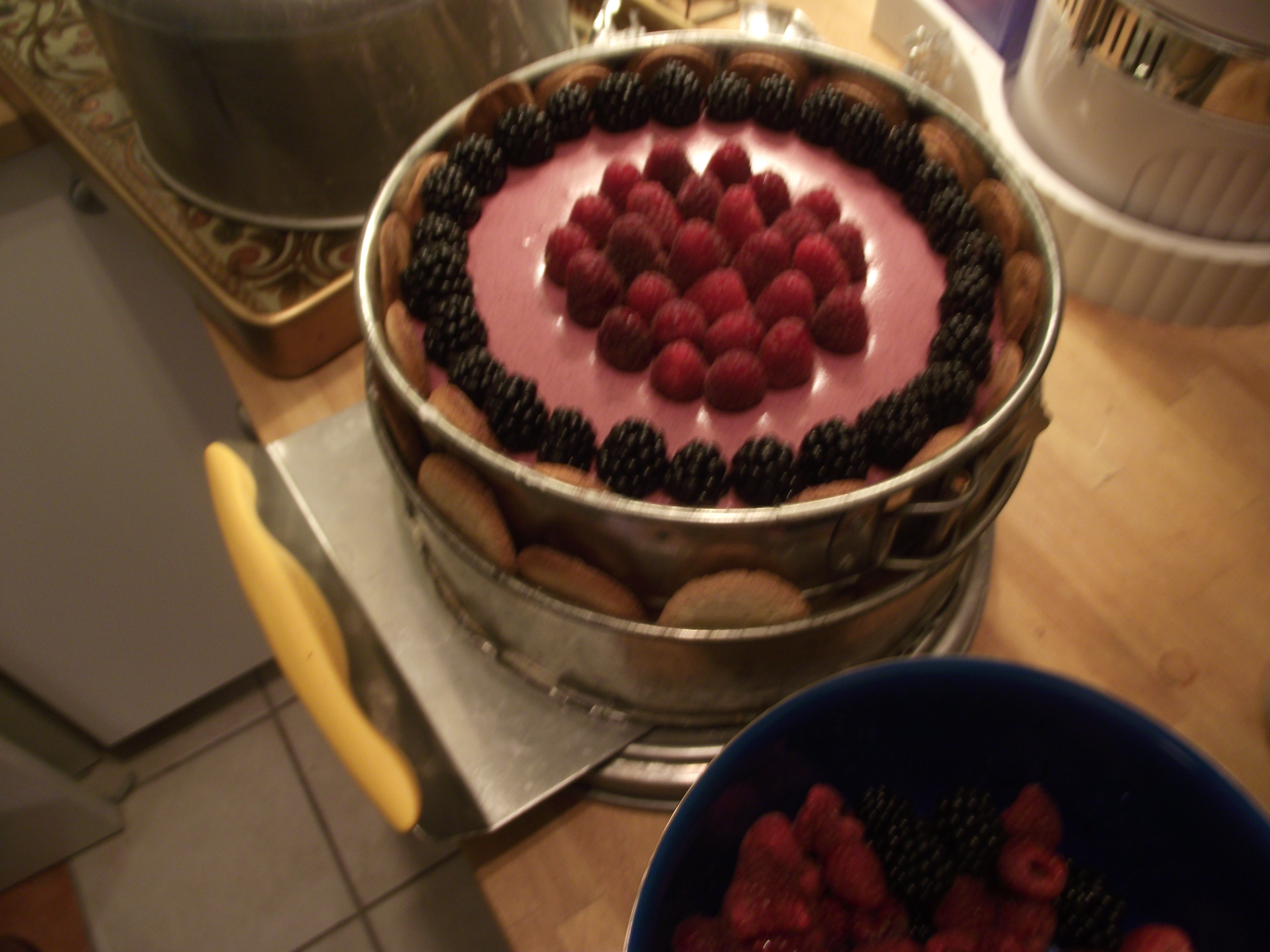 Topping the cake with fresh raspberries and blackberries