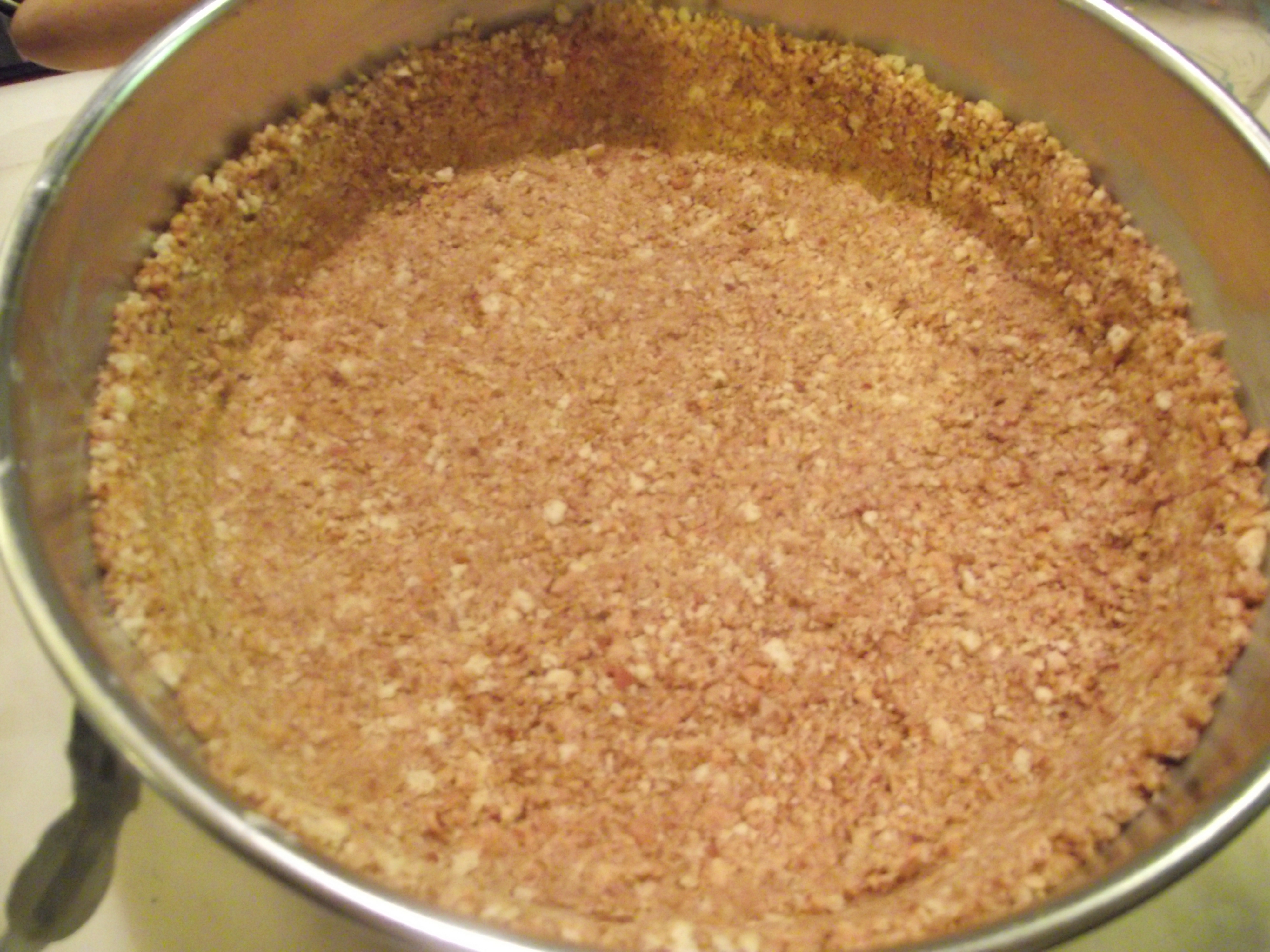 Fully formed and packed cookie crumb crust for cheesecake