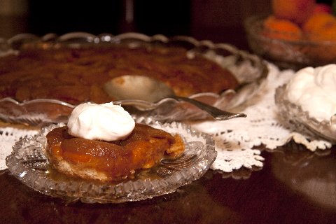 apple pandoughdy serving with whipped cream in front of platter
