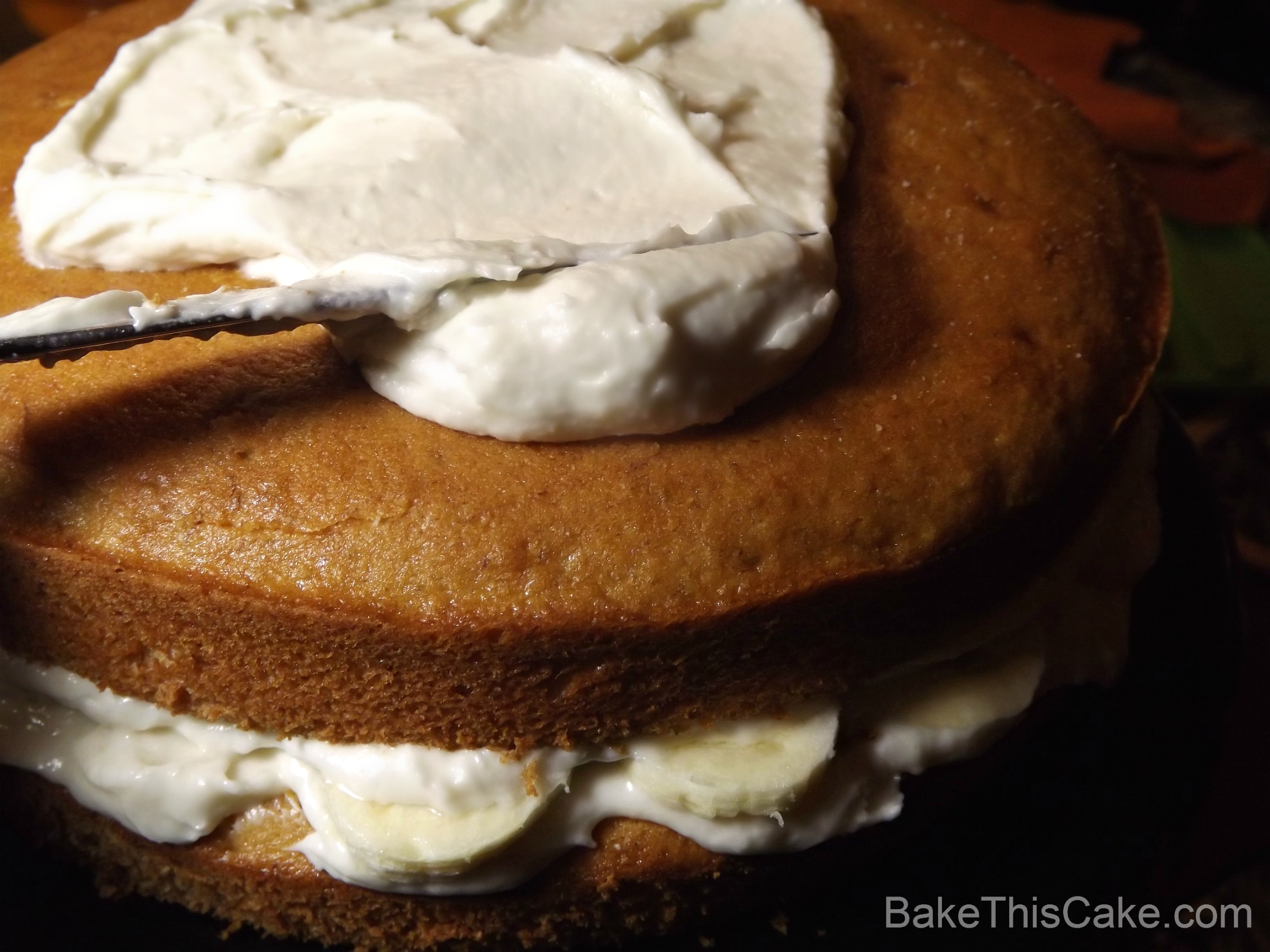 Slice about 2 or 3 fresh bananas and push them very gently into the frosting that you’ve spread on the bottom layer of the cake.